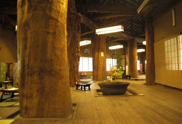由於業主的祖先經營木材業,旅館使用樹齡300年~快接近1000年被稱作珍貴木材或是大樹建造而成,寧靜的氛圍非常具有魅力。而晚餐的【地爐深山懷石料理】則是在設有7座地爐的別館內享用。能品嚐到高山蔬菜及山野菜、串燒、日式和牛鐵板燒等使用當季食材的料理,實在是令人開心。