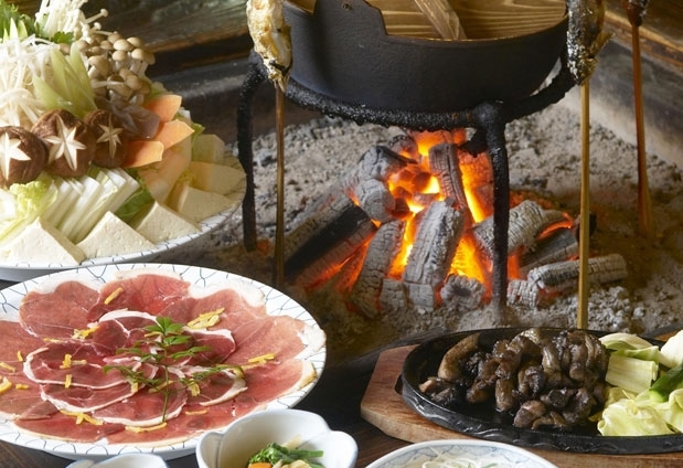 在茅草屋頂的【式部屋敷】餐廳裡,圍著地爐品嚐山豬火鍋會席料理、鮎魚料理以及宮崎牛燒肉等!圍在充滿地爐氛圍的空間裡,享受在地感十足的料理,只有公家旅館才能享受的低價格體驗是其重點之一。