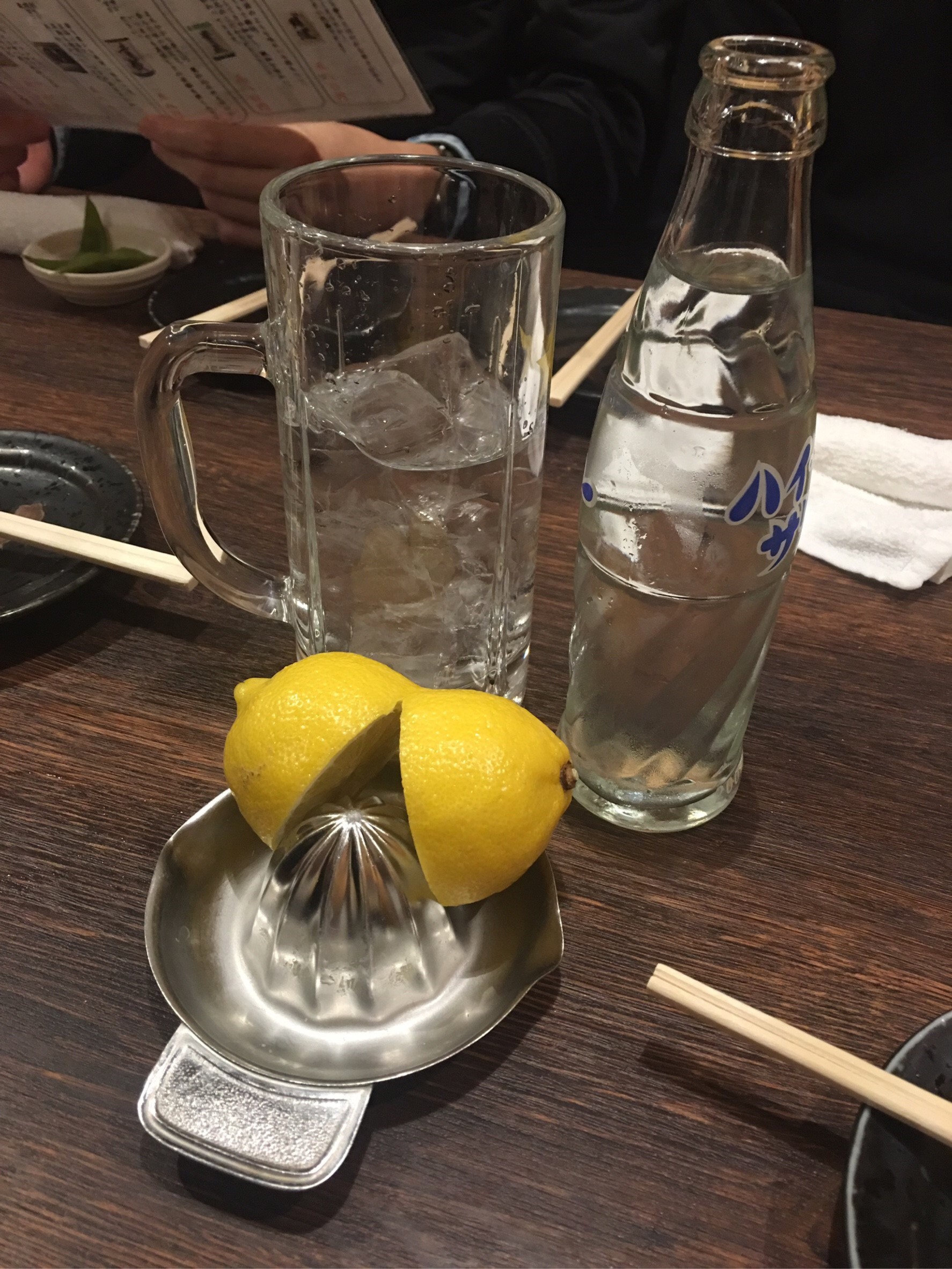 店內裝潢以沈靜的黑色為主,搭配上原木色,顯得高級有格調。店裡的檸檬沙瓦有2種,一種是手榨半顆檸檬後泡在沙瓦裡面的「super檸檬沙瓦」,另一種則是是店家自家特製的蜂蜜檸檬特製的檸檬沙瓦,酸酸甜甜的好滋味,是就連害怕檸檬酸味的人也可以安心享受的美味。