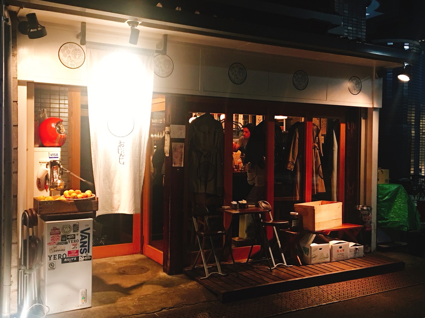 門外擺放著像山一樣高的啤酒箱,和富有歷史感的燈箱是它的特徵。店內牆上貼的海報和菜單等,一入店內便能感受到濃濃的昭和感飄散空氣中。小小的店,包含吧台位置竟然能擠出五十個坐位,因為它的狹小,經常需要和隔壁的客人一起併桌,因此也可以結交到很多不同領域卻同樣熱愛「ばん」或檸檬沙瓦的同好。