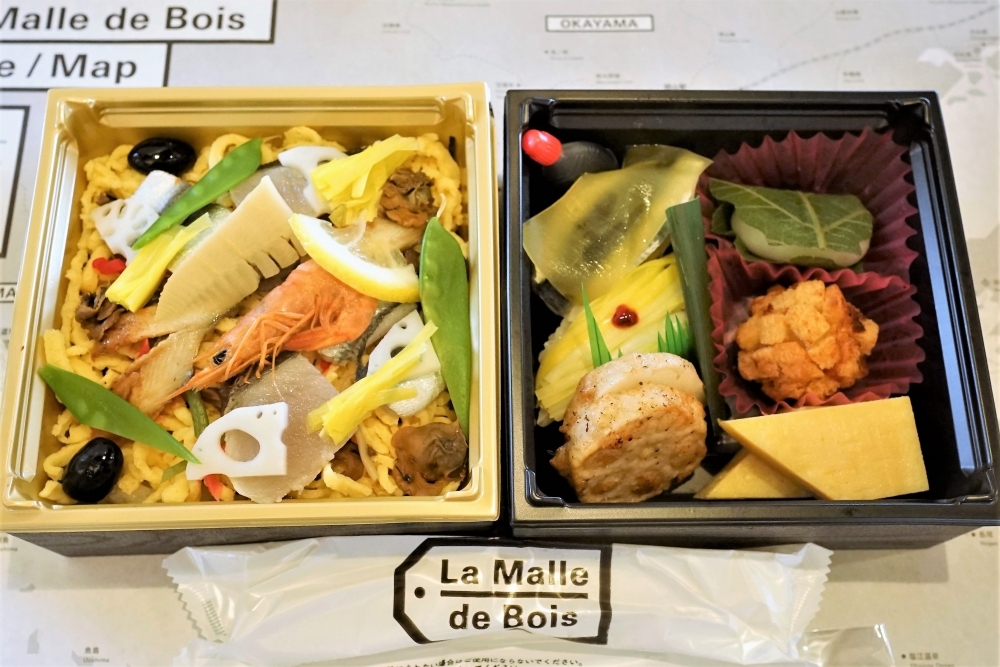 這次則是購買了公司內部限定販售的「旅行小盒」。內有青花魚壽司及備前散壽司等,可以盡情享受岡山名產。外頭包裹著桃太郎印花便當包巾,設計相當的可愛呢。