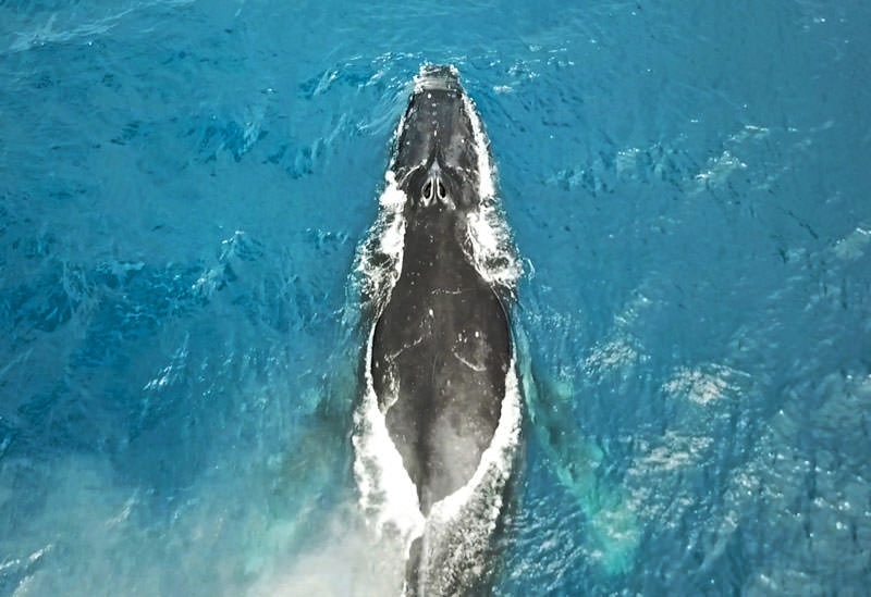 動畫一開始最前面有幾個激起浪花的,是正在追著鯨魚的游泳的人。他們的前方有一對鯨魚伴侶。空拍機超越人群追上了鯨魚,從正上方捕捉到他們在浪潮中游泳噴水的英姿。這對伴侶將尾巴突出海面向下潛入海中的時候,畫面左邊出現了鯨魚小孩的身影。