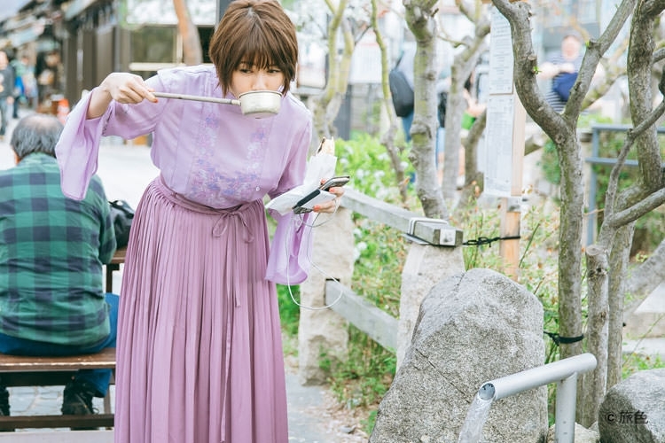 在路的入口附近找到【なわて若がえりの水】(中譯:繩手返老還童之水)的真木小姐舀了一大勺的水一口氣全喝光了呢!