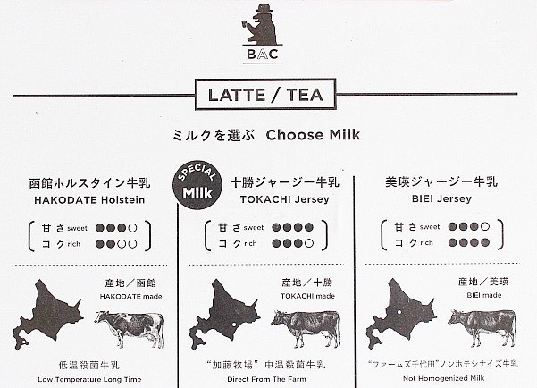 如果你喜歡喝拿鐵的朋友,一定要試試他們家的拿鐵,利用地緣優勢,使用的牛奶都是北海道罕見的牛奶品牌,像是美瑛ジャージー牛乳、函館ホルスタイン牛乳、十勝ジャージー等等,口味部分連牛奶的甜度、濃度、和醇度也都標示非常清楚,像是函館的就是最圓潤順口、十勝的最甜、美瑛的則是最有層次,BARISTART COFFEE對牛奶的堅持,令人大開眼界,除了可以自己選擇牛奶之外,連咖啡豆也可以選擇唷!